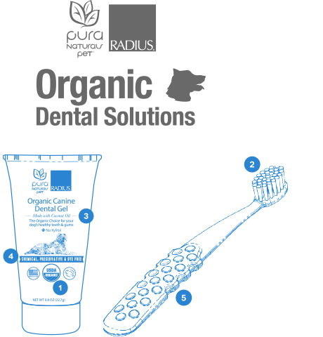 We’ve partnered with Pura Naturals Pet® to bring you and your favorite canine an organic dental solution that will help keep those canines healthy for life. Our organic dental kit contains a premium toothbrush and a handy 0.8 ounce travel tube of organic gel toothpaste.